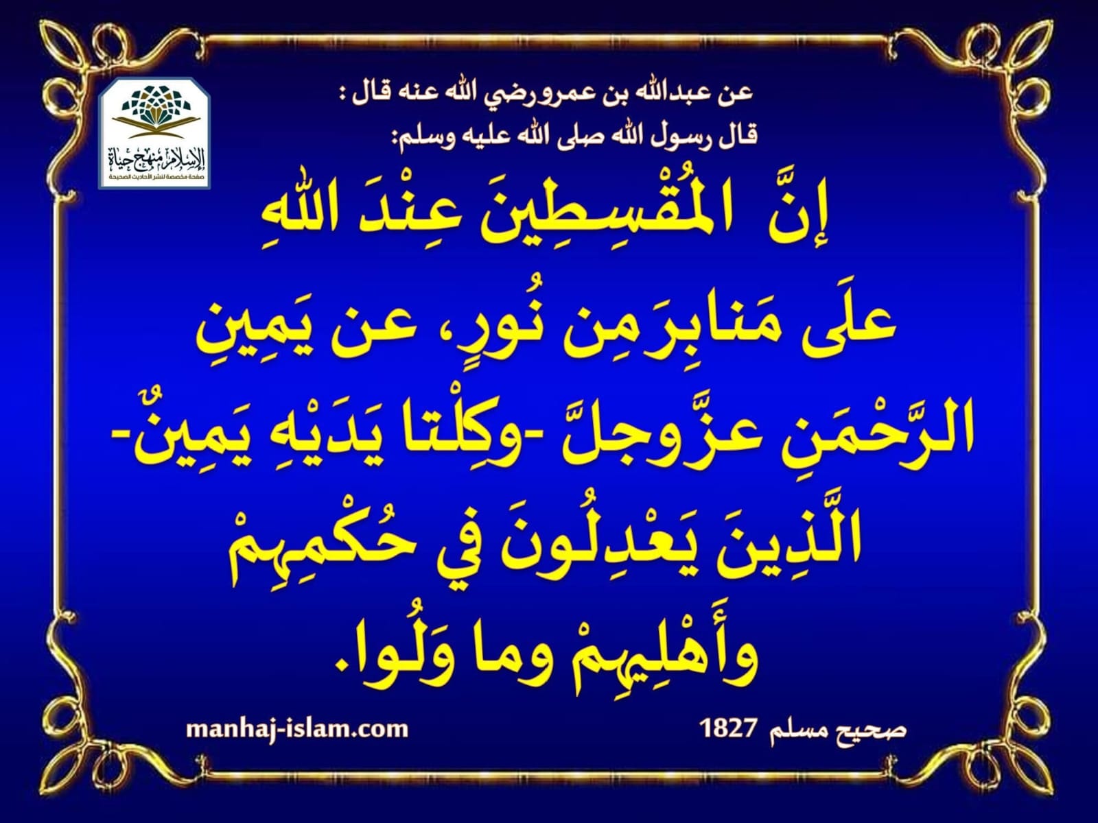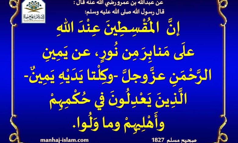 عن عبدالله بن عمرو رضي الله عنه قال : قال رسول الله صلى الله عليه وسلم : إنَّ المُقْسِطِينَ عِنْدَ اللهِ علَى مَنابِرَ مِن نُورٍ، عن يَمِينِ الرَّحْمَنِ عزَّ وجلَّ -وكِلْتا يَدَيْهِ يَمِينٌ- الَّذِينَ يَعْدِلُونَ في حُكْمِهِمْ وأَهْلِيهِمْ وما وَلُوا.