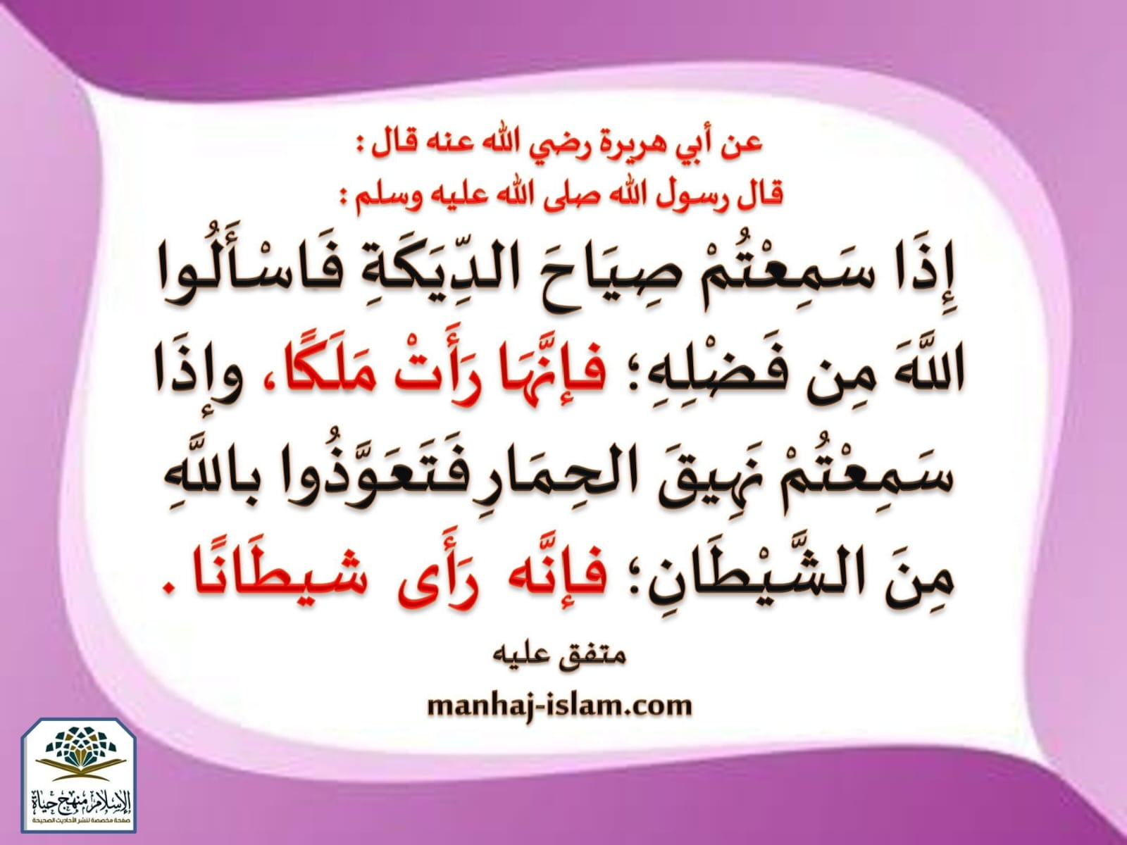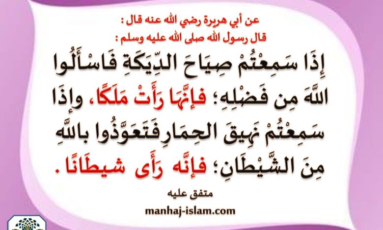 عن أبي هريرة رضي الله عنه قال : قال رسول الله صلى الله عليه وسلم : إِذَا سَمِعْتُمْ صِيَاحَ الدِّيَكَةِ فَاسْأَلُوا اللَّهَ مِن فَضْلِهِ؛ فإنَّهَا رَأَتْ مَلَكًا، وإذَا سَمِعْتُمْ نَهِيقَ الحِمَارِ فَتَعَوَّذُوا باللَّهِ مِنَ الشَّيْطَانِ؛ فإنَّه رَأَى شيطَانًا.