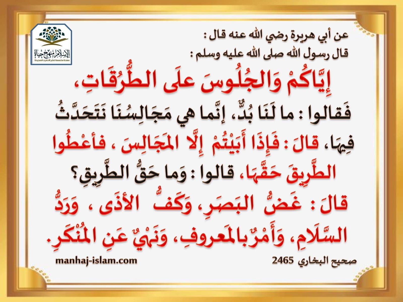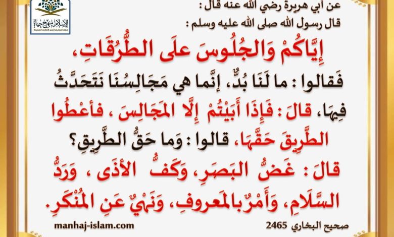 عن أبي هريرة رضي الله عنه قال : قال رسول الله صلى الله عليه وسلم : إِيَّاكُمْ وَالجُلُوسَ علَى الطُّرُقَاتِ، فَقالوا: ما لَنَا بُدٌّ، إنَّما هي مَجَالِسُنَا نَتَحَدَّثُ فِيهَا، قالَ: فَإِذَا أَبَيْتُمْ إِلَّا المَجَالِسَ، فأعْطُوا الطَّرِيقَ حَقَّهَا، قالوا: وَما حَقُّ الطَّرِيقِ؟ قالَ: غَضُّ البَصَرِ، وَكَفُّ الأذَى، وَرَدُّ السَّلَامِ، وَأَمْرٌ بالمَعروفِ، وَنَهْيٌ عَنِ المُنْكَرِ.