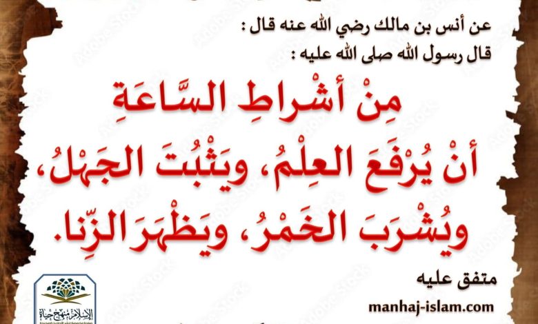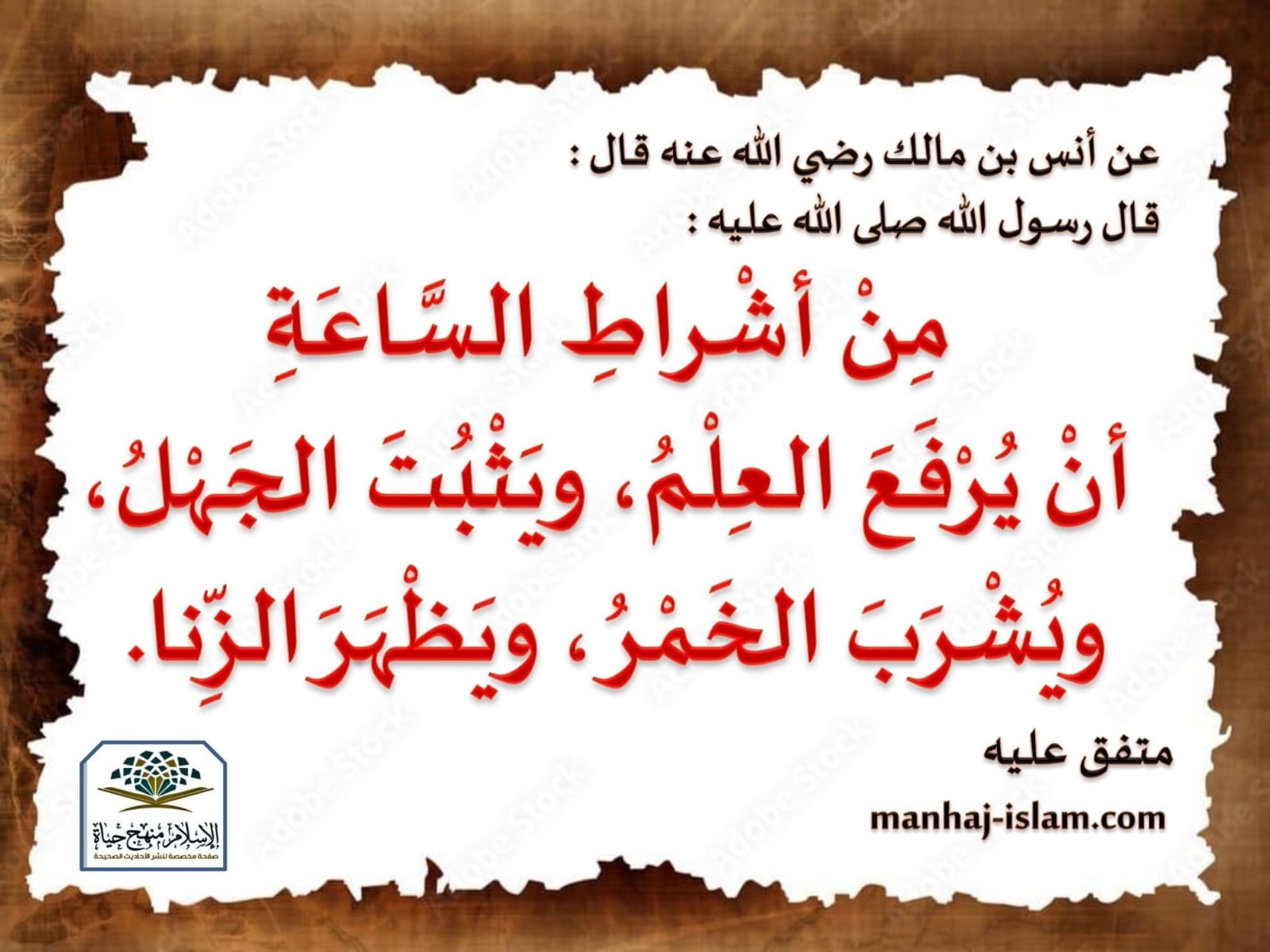 عن أنس بن مالك رضي الله عنه قال : قال رسول الله صلى الله عليه : مِنْ أشْراطِ السَّاعَةِ أنْ يُرْفَعَ العِلْمُ، ويَثْبُتَ الجَهْلُ، ويُشْرَبَ الخَمْرُ، ويَظْهَرَ الزِّنا.